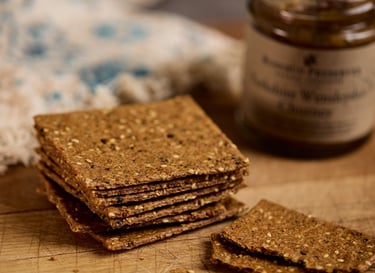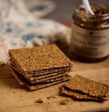 A brilliant collaboration between two Yorkshire icons. The talented bakers at Sawley Kitchen have taken malted barley from the legendary Theakston's Brewery to create these wonderfully light, crisp, and savoury crackers. They have a unique, malty flavour that is simply irresistible.